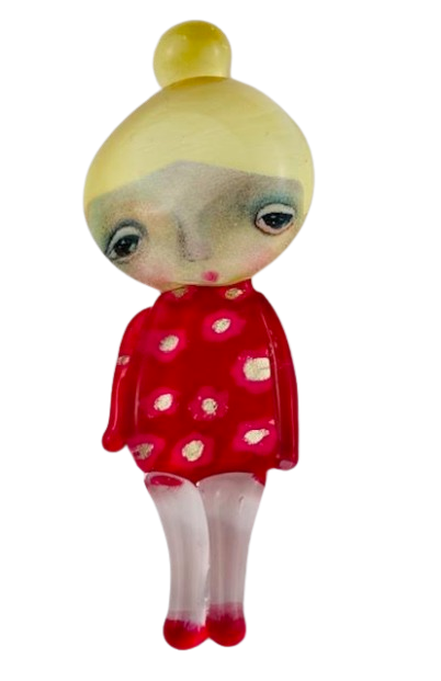 Autorska broszka wykonana z pełnego szkła, wytapiana ręcznie i malowana. Szkło hartowane, najwyższej jakości, bardzo trwałe. Każda z laleczek jest unikatowa - ręcznie malowana, szklana soczewka daje efekt złudzenia optycznego i głębi spojrzenia.