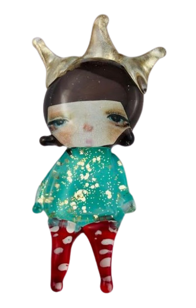 Autorska broszka wykonana z pełnego szkła, wytapiana ręcznie i malowana. Szkło hartowane, najwyższej jakości, bardzo trwałe. Każda z laleczek jest unikatowa - ręcznie malowana, szklana soczewka daje efekt złudzenia optycznego i głębi spojrzenia.