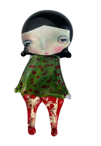 Autorska broszka wykonana z pełnego szkła, wytapiana ręcznie i malowana. Szkło hartowane, najwyższej jakości, bardzo trwałe. Każda z laleczek jest unikatowa - ręcznie malowana, szklana soczewka daje efekt złudzenia optycznego i głębi spojrzenia.