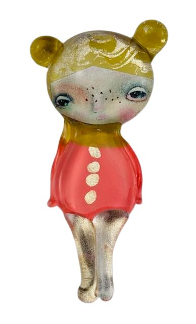 Autorska broszka wykonana z pełnego szkła, wytapiana ręcznie i malowana. Szkło hartowane, najwyższej jakości, bardzo trwałe. Każda z laleczek jest unikatowa - ręcznie malowana, szklana soczewka daje efekt złudzenia optycznego i głębi spojrzenia.