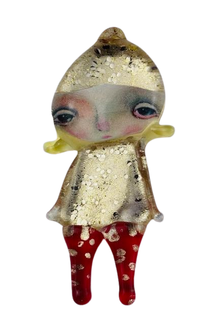 Autorska broszka wykonana z pełnego szkła, wytapiana ręcznie i malowana. Szkło hartowane, najwyższej jakości, bardzo trwałe. Każda z laleczek jest unikatowa - ręcznie malowana, szklana soczewka daje efekt złudzenia optycznego i głębi spojrzenia.