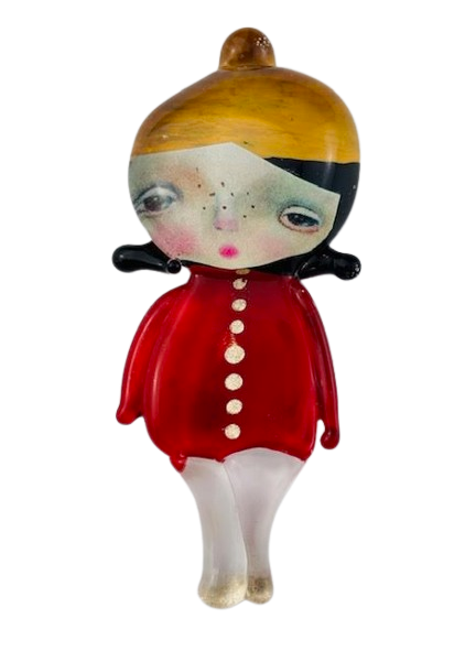 Autorska broszka wykonana z pełnego szkła, wytapiana ręcznie i malowana. Szkło hartowane, najwyższej jakości, bardzo trwałe. Każda z laleczek jest unikatowa - ręcznie malowana, szklana soczewka daje efekt złudzenia optycznego i głębi spojrzenia.