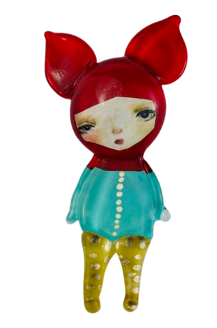 Autorska broszka wykonana z pełnego szkła, wytapiana ręcznie i malowana. Szkło hartowane, najwyższej jakości, bardzo trwałe. Każda z laleczek jest unikatowa - ręcznie malowana, szklana soczewka daje efekt złudzenia optycznego i głębi spojrzenia.