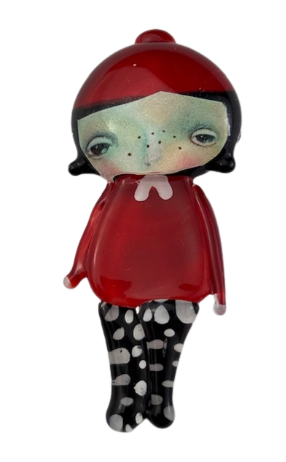 Autorska broszka wykonana z pełnego szkła, wytapiana ręcznie i malowana. Szkło hartowane, najwyższej jakości, bardzo trwałe. Każda z laleczek jest unikatowa - ręcznie malowana, szklana soczewka daje efekt złudzenia optycznego i głębi spojrzenia.