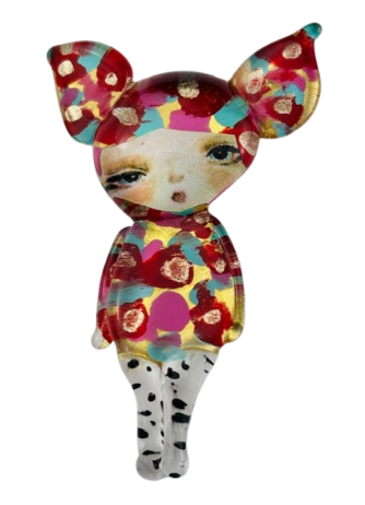 Autorska broszka wykonana z pełnego szkła, wytapiana ręcznie i malowana. Szkło hartowane, najwyższej jakości, bardzo trwałe. Każda z laleczek jest unikatowa - ręcznie malowana, szklana soczewka daje efekt złudzenia optycznego i głębi spojrzenia.