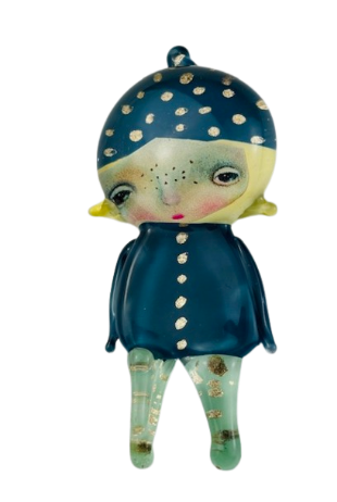 Autorska broszka wykonana z pełnego szkła, wytapiana ręcznie i malowana. Szkło hartowane, najwyższej jakości, bardzo trwałe. Każda z laleczek jest unikatowa - ręcznie malowana, szklana soczewka daje efekt złudzenia optycznego i głębi spojrzenia.