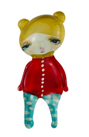 Autorska broszka wykonana z pełnego szkła, wytapiana ręcznie i malowana. Szkło hartowane, najwyższej jakości, bardzo trwałe. Każda z laleczek jest unikatowa - ręcznie malowana, szklana soczewka daje efekt złudzenia optycznego i głębi spojrzenia.
