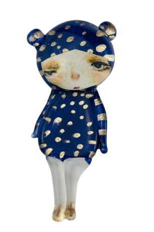 Autorska broszka wykonana z pełnego szkła, wytapiana ręcznie i malowana. Szkło hartowane, najwyższej jakości, bardzo trwałe. Każda z laleczek jest unikatowa - ręcznie malowana, szklana soczewka daje efekt złudzenia optycznego i głębi spojrzenia.