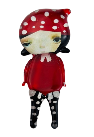 Autorska broszka wykonana z pełnego szkła, wytapiana ręcznie i malowana. Szkło hartowane, najwyższej jakości, bardzo trwałe. Każda z laleczek jest unikatowa - ręcznie malowana, szklana soczewka daje efekt złudzenia optycznego i głębi spojrzenia.