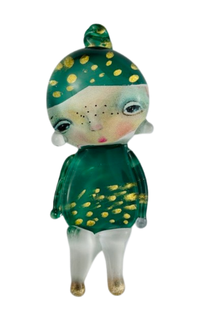 Autorska broszka wykonana z pełnego szkła, wytapiana ręcznie i malowana. Szkło hartowane, najwyższej jakości, bardzo trwałe. Każda z laleczek jest unikatowa - ręcznie malowana, szklana soczewka daje efekt złudzenia optycznego i głębi spojrzenia.