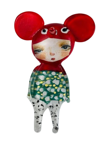 Autorska broszka wykonana z pełnego szkła, wytapiana ręcznie i malowana. Szkło hartowane, najwyższej jakości, bardzo trwałe. Każda z laleczek jest unikatowa - ręcznie malowana, szklana soczewka daje efekt złudzenia optycznego i głębi spojrzenia.