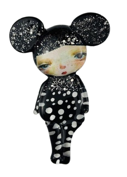 Autorska broszka wykonana z pełnego szkła, wytapiana ręcznie i malowana. Szkło hartowane, najwyższej jakości, bardzo trwałe. Każda z laleczek jest unikatowa - ręcznie malowana, szklana soczewka daje efekt złudzenia optycznego i głębi spojrzenia.