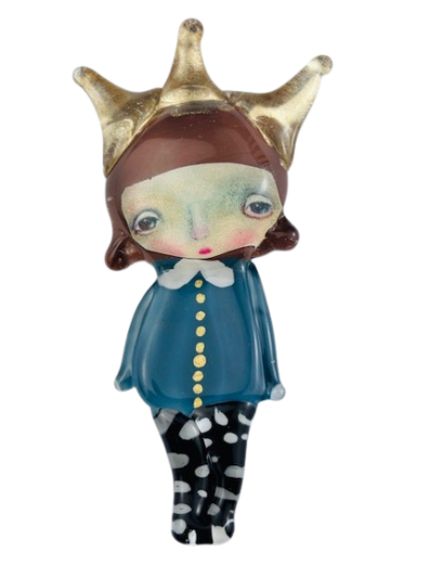 Autorska broszka wykonana z pełnego szkła, wytapiana ręcznie i malowana. Szkło hartowane, najwyższej jakości, bardzo trwałe. Każda z laleczek jest unikatowa - ręcznie malowana, szklana soczewka daje efekt złudzenia optycznego i głębi spojrzenia.