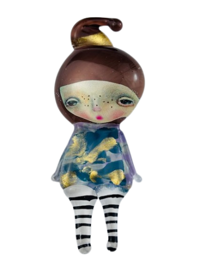Autorska broszka wykonana z pełnego szkła, wytapiana ręcznie i malowana. Szkło hartowane, najwyższej jakości, bardzo trwałe. Każda z laleczek jest unikatowa - ręcznie malowana, szklana soczewka daje efekt złudzenia optycznego i głębi spojrzenia.