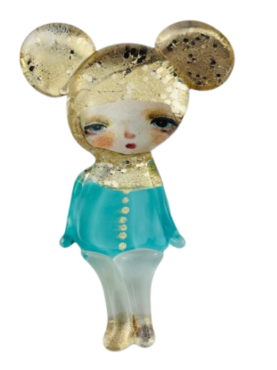 Autorska broszka wykonana z pełnego szkła, wytapiana ręcznie i malowana. Szkło hartowane, najwyższej jakości, bardzo trwałe. Każda z laleczek jest unikatowa - ręcznie malowana, szklana soczewka daje efekt złudzenia optycznego i głębi spojrzenia.