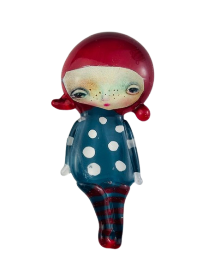 Autorska broszka wykonana z pełnego szkła, wytapiana ręcznie i malowana. Szkło hartowane, najwyższej jakości, bardzo trwałe. Każda z laleczek jest unikatowa - ręcznie malowana, szklana soczewka daje efekt złudzenia optycznego i głębi spojrzenia.