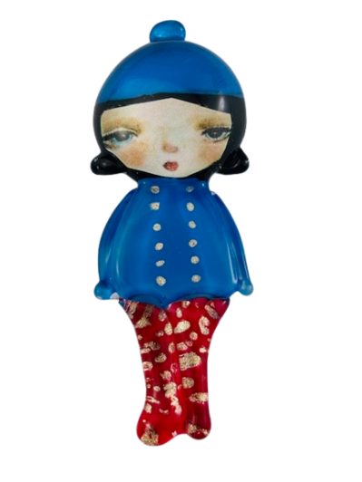 Autorska broszka wykonana z pełnego szkła, wytapiana ręcznie i malowana. Szkło hartowane, najwyższej jakości, bardzo trwałe. Każda z laleczek jest unikatowa - ręcznie malowana, szklana soczewka daje efekt złudzenia optycznego i głębi spojrzenia.