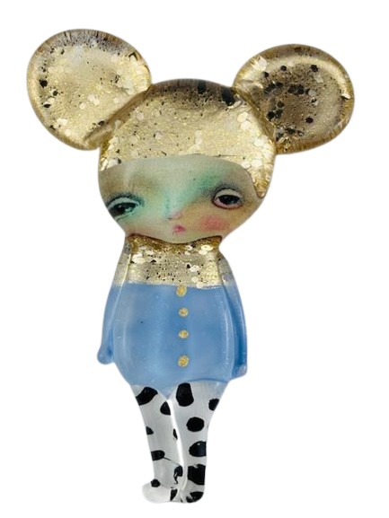 Autorska broszka wykonana z pełnego szkła, wytapiana ręcznie i malowana. Szkło hartowane, najwyższej jakości, bardzo trwałe. Każda z laleczek jest unikatowa - ręcznie malowana, szklana soczewka daje efekt złudzenia optycznego i głębi spojrzenia.