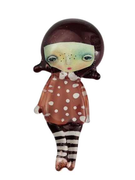 Autorska broszka wykonana z pełnego szkła, wytapiana ręcznie i malowana. Szkło hartowane, najwyższej jakości, bardzo trwałe. Każda z laleczek jest unikatowa - ręcznie malowana, szklana soczewka daje efekt złudzenia optycznego i głębi spojrzenia.