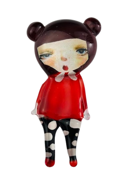 Autorska broszka wykonana z pełnego szkła, wytapiana ręcznie i malowana. Szkło hartowane, najwyższej jakości, bardzo trwałe. Każda z laleczek jest unikatowa - ręcznie malowana, szklana soczewka daje efekt złudzenia optycznego i głębi spojrzenia.