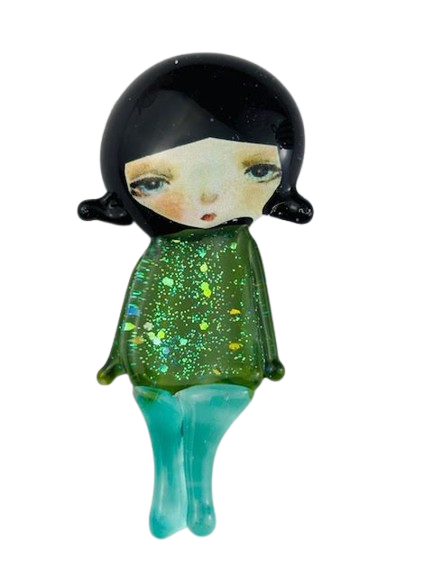 Autorska broszka wykonana z pełnego szkła, wytapiana ręcznie i malowana. Szkło hartowane, najwyższej jakości, bardzo trwałe. Każda z laleczek jest unikatowa - ręcznie malowana, szklana soczewka daje efekt złudzenia optycznego i głębi spojrzenia.