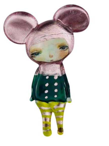 Autorska broszka wykonana z pełnego szkła, wytapiana ręcznie i malowana. Szkło hartowane, najwyższej jakości, bardzo trwałe. Każda z laleczek jest unikatowa - ręcznie malowana, szklana soczewka daje efekt złudzenia optycznego i głębi spojrzenia.