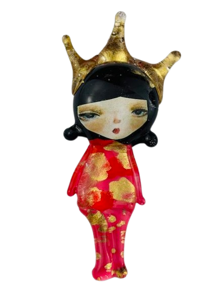 Autorska broszka wykonana z pełnego szkła, wytapiana ręcznie i malowana. Szkło hartowane, najwyższej jakości, bardzo trwałe. Każda z laleczek jest unikatowa - ręcznie malowana, szklana soczewka daje efekt złudzenia optycznego i głębi spojrzenia.