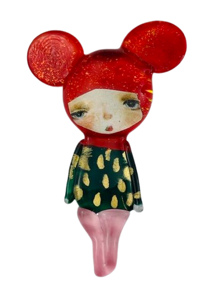 Autorska broszka wykonana z pełnego szkła, wytapiana ręcznie i malowana. Szkło hartowane, najwyższej jakości, bardzo trwałe. Każda z laleczek jest unikatowa - ręcznie malowana, szklana soczewka daje efekt złudzenia optycznego i głębi spojrzenia.