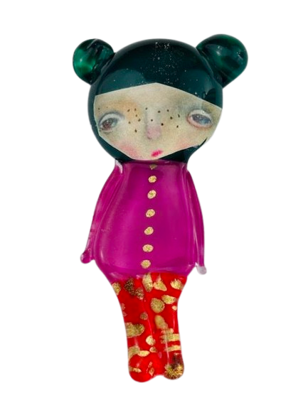 Autorska broszka wykonana z pełnego szkła, wytapiana ręcznie i malowana. Szkło hartowane, najwyższej jakości, bardzo trwałe. Każda z laleczek jest unikatowa - ręcznie malowana, szklana soczewka daje efekt złudzenia optycznego i głębi spojrzenia.