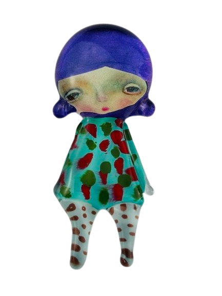Autorska broszka wykonana z pełnego szkła, wytapiana ręcznie i malowana. Szkło hartowane, najwyższej jakości, bardzo trwałe. Każda z laleczek jest unikatowa - ręcznie malowana, szklana soczewka daje efekt złudzenia optycznego i głębi spojrzenia.
