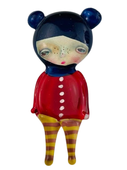 Autorska broszka wykonana z pełnego szkła, wytapiana ręcznie i malowana. Szkło hartowane, najwyższej jakości, bardzo trwałe. Każda z laleczek jest unikatowa - ręcznie malowana, szklana soczewka daje efekt złudzenia optycznego i głębi spojrzenia.