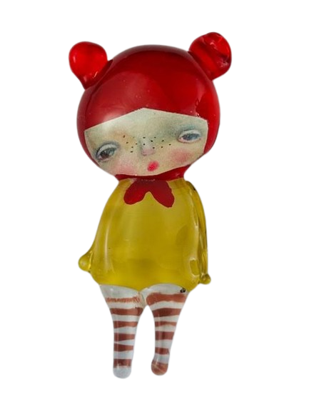 Autorska broszka wykonana z pełnego szkła, wytapiana ręcznie i malowana. Szkło hartowane, najwyższej jakości, bardzo trwałe. Każda z laleczek jest unikatowa - ręcznie malowana, szklana soczewka daje efekt złudzenia optycznego i głębi spojrzenia.
