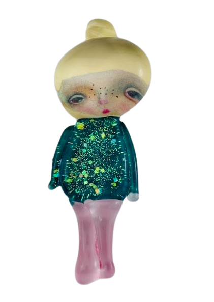 Autorska broszka wykonana z pełnego szkła, wytapiana ręcznie i malowana. Szkło hartowane, najwyższej jakości, bardzo trwałe. Każda z laleczek jest unikatowa - ręcznie malowana, szklana soczewka daje efekt złudzenia optycznego i głębi spojrzenia.