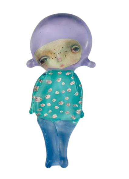 Autorska broszka wykonana z pełnego szkła, wytapiana ręcznie i malowana. Szkło hartowane, najwyższej jakości, bardzo trwałe. Każda z laleczek jest unikatowa - ręcznie malowana, szklana soczewka daje efekt złudzenia optycznego i głębi spojrzenia.