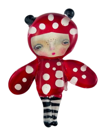 Autorska broszka wykonana z pełnego szkła, wytapiana ręcznie i malowana. Szkło hartowane, najwyższej jakości, bardzo trwałe. Każda z laleczek jest unikatowa - ręcznie malowana, szklana soczewka daje efekt złudzenia optycznego i głębi spojrzenia.