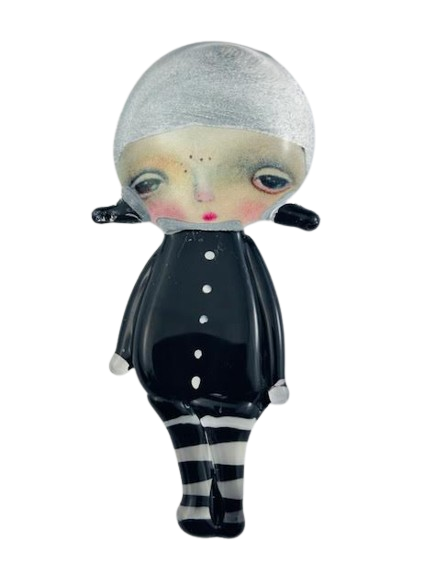 Autorska broszka wykonana z pełnego szkła, wytapiana ręcznie i malowana. Szkło hartowane, najwyższej jakości, bardzo trwałe. Każda z laleczek jest unikatowa - ręcznie malowana, szklana soczewka daje efekt złudzenia optycznego i głębi spojrzenia.