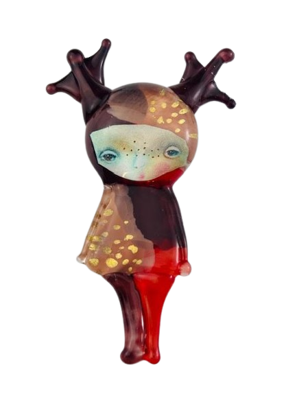 Autorska broszka wykonana z pełnego szkła, wytapiana ręcznie i malowana. Szkło hartowane, najwyższej jakości, bardzo trwałe. Każda z laleczek jest unikatowa - ręcznie malowana, szklana soczewka daje efekt złudzenia optycznego i głębi spojrzenia.