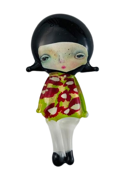 Autorska broszka wykonana z pełnego szkła, wytapiana ręcznie i malowana. Szkło hartowane, najwyższej jakości, bardzo trwałe. Każda z laleczek jest unikatowa - ręcznie malowana, szklana soczewka daje efekt złudzenia optycznego i głębi spojrzenia.