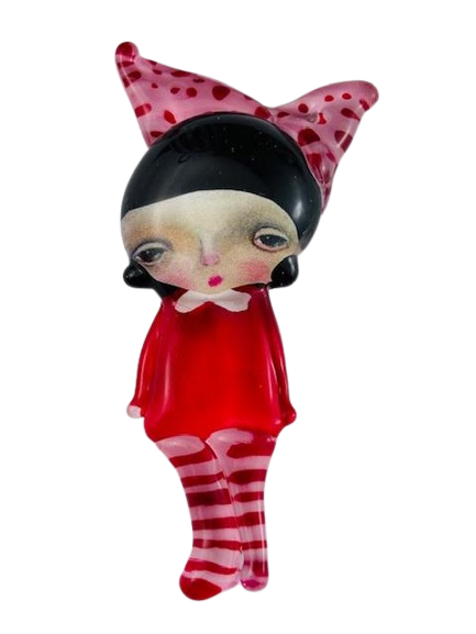 Autorska broszka wykonana z pełnego szkła, wytapiana ręcznie i malowana. Szkło hartowane, najwyższej jakości, bardzo trwałe. Każda z laleczek jest unikatowa - ręcznie malowana, szklana soczewka daje efekt złudzenia optycznego i głębi spojrzenia.