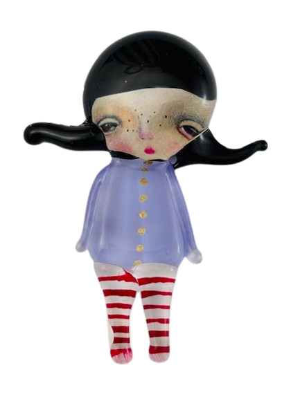 Autorska broszka wykonana z pełnego szkła, wytapiana ręcznie i malowana. Szkło hartowane, najwyższej jakości, bardzo trwałe. Każda z laleczek jest unikatowa - ręcznie malowana, szklana soczewka daje efekt złudzenia optycznego i głębi spojrzenia.
