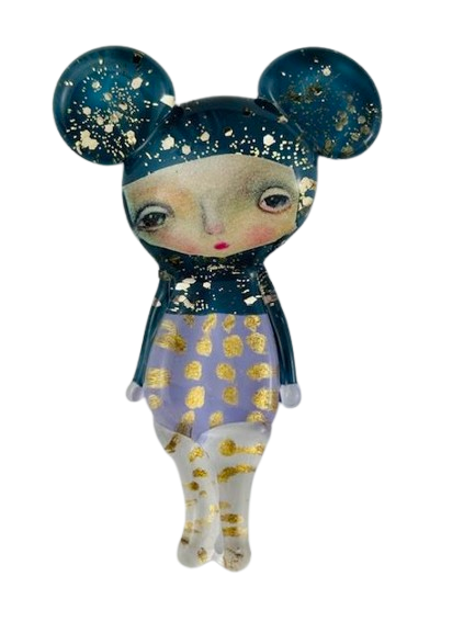 Autorska broszka wykonana z pełnego szkła, wytapiana ręcznie i malowana. Szkło hartowane, najwyższej jakości, bardzo trwałe. Każda z laleczek jest unikatowa - ręcznie malowana, szklana soczewka daje efekt złudzenia optycznego i głębi spojrzenia.