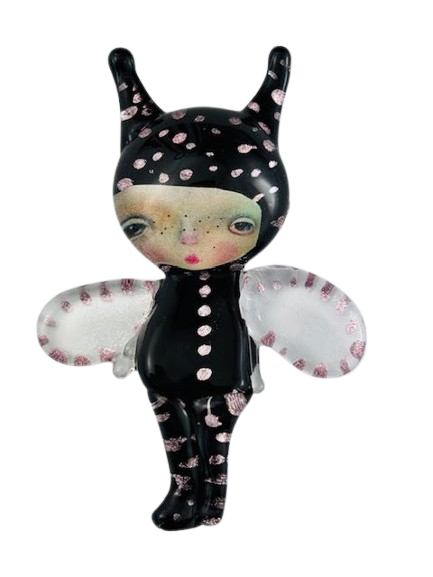 Autorska broszka wykonana z pełnego szkła, wytapiana ręcznie i malowana. Szkło hartowane, najwyższej jakości, bardzo trwałe. Każda z laleczek jest unikatowa - ręcznie malowana, szklana soczewka daje efekt złudzenia optycznego i głębi spojrzenia.