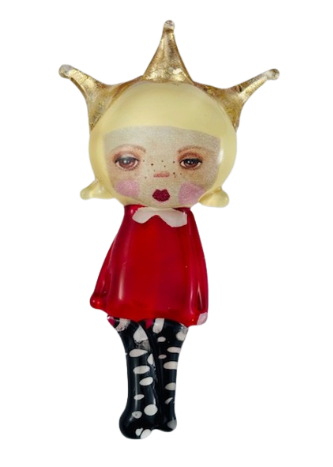 Autorska broszka wykonana z pełnego szkła, wytapiana ręcznie i malowana. Szkło hartowane, najwyższej jakości, bardzo trwałe. Każda z laleczek jest unikatowa - ręcznie malowana, szklana soczewka daje efekt złudzenia optycznego i głębi spojrzenia.