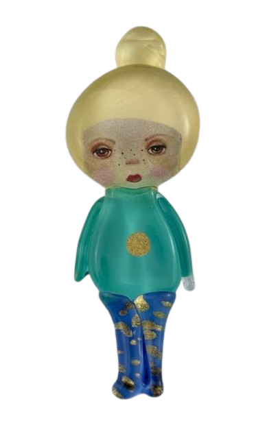 Autorska broszka wykonana z pełnego szkła, wytapiana ręcznie i malowana. Szkło hartowane, najwyższej jakości, bardzo trwałe. Każda z laleczek jest unikatowa - ręcznie malowana, szklana soczewka daje efekt złudzenia optycznego i głębi spojrzenia.