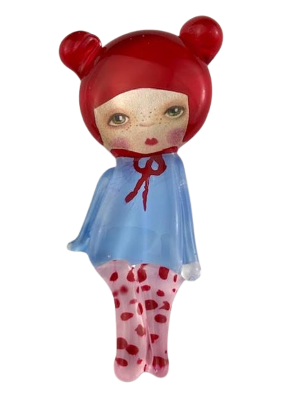 Autorska broszka wykonana z pełnego szkła, wytapiana ręcznie i malowana. Szkło hartowane, najwyższej jakości, bardzo trwałe. Każda z laleczek jest unikatowa - ręcznie malowana, szklana soczewka daje efekt złudzenia optycznego i głębi spojrzenia.