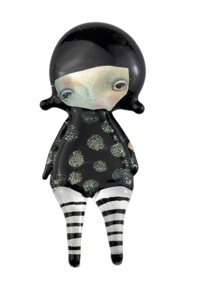 Autorska broszka wykonana z pełnego szkła, wytapiana ręcznie i malowana. Szkło hartowane, najwyższej jakości, bardzo trwałe. Każda z laleczek jest unikatowa - ręcznie malowana, szklana soczewka daje efekt złudzenia optycznego i głębi spojrzenia.