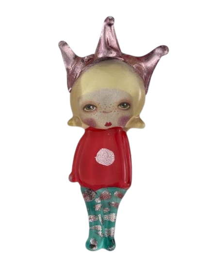 Autorska broszka wykonana z pełnego szkła, wytapiana ręcznie i malowana. Szkło hartowane, najwyższej jakości, bardzo trwałe. Każda z laleczek jest unikatowa - ręcznie malowana, szklana soczewka daje efekt złudzenia optycznego i głębi spojrzenia.