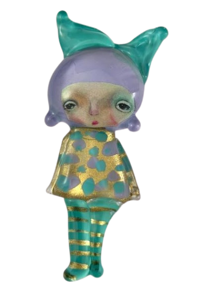 Autorska broszka wykonana z pełnego szkła, wytapiana ręcznie i malowana. Szkło hartowane, najwyższej jakości, bardzo trwałe. Każda z laleczek jest unikatowa - ręcznie malowana, szklana soczewka daje efekt złudzenia optycznego i głębi spojrzenia.