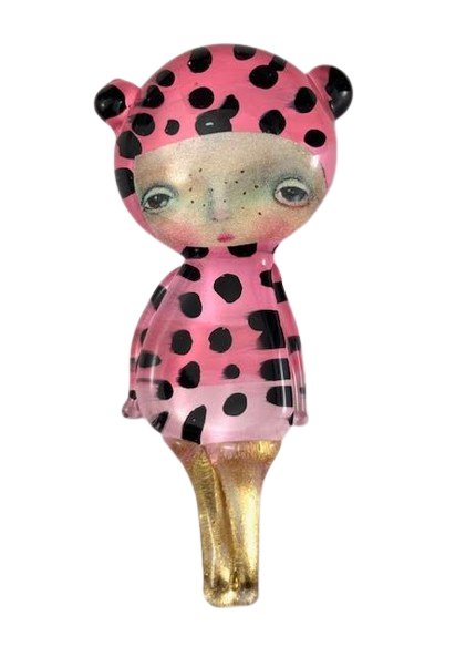 Autorska broszka wykonana z pełnego szkła, wytapiana ręcznie i malowana. Szkło hartowane, najwyższej jakości, bardzo trwałe. Każda z laleczek jest unikatowa - ręcznie malowana, szklana soczewka daje efekt złudzenia optycznego i głębi spojrzenia.
