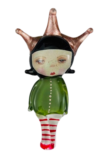 Autorska broszka wykonana z pełnego szkła, wytapiana ręcznie i malowana. Szkło hartowane, najwyższej jakości, bardzo trwałe. Każda z laleczek jest unikatowa - ręcznie malowana, szklana soczewka daje efekt złudzenia optycznego i głębi spojrzenia.